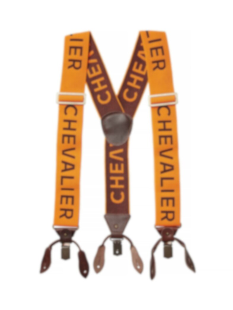 Chevalier Logo Suspenders sind breite, verstellbare Hosenträger, die mit Metallklammern oder Knopfhalterungen aus echtem Leder an der Hose befestigt werden.