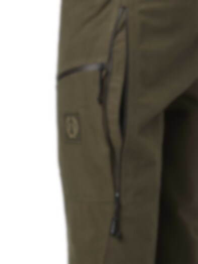 Die Hose verfügt über durchdachte und praktische Taschen, wie fleecegefütterte Handtaschen. An beiden Beinen befinden sich geräumige Blasebalgtaschen, die mit wasserabweisenden Reißverschlüssen geschlossen werden. In der rechten Beintasche befindet sich eine Handytasche aus Mesh und in der linken eine elastische Patronenhalterung.